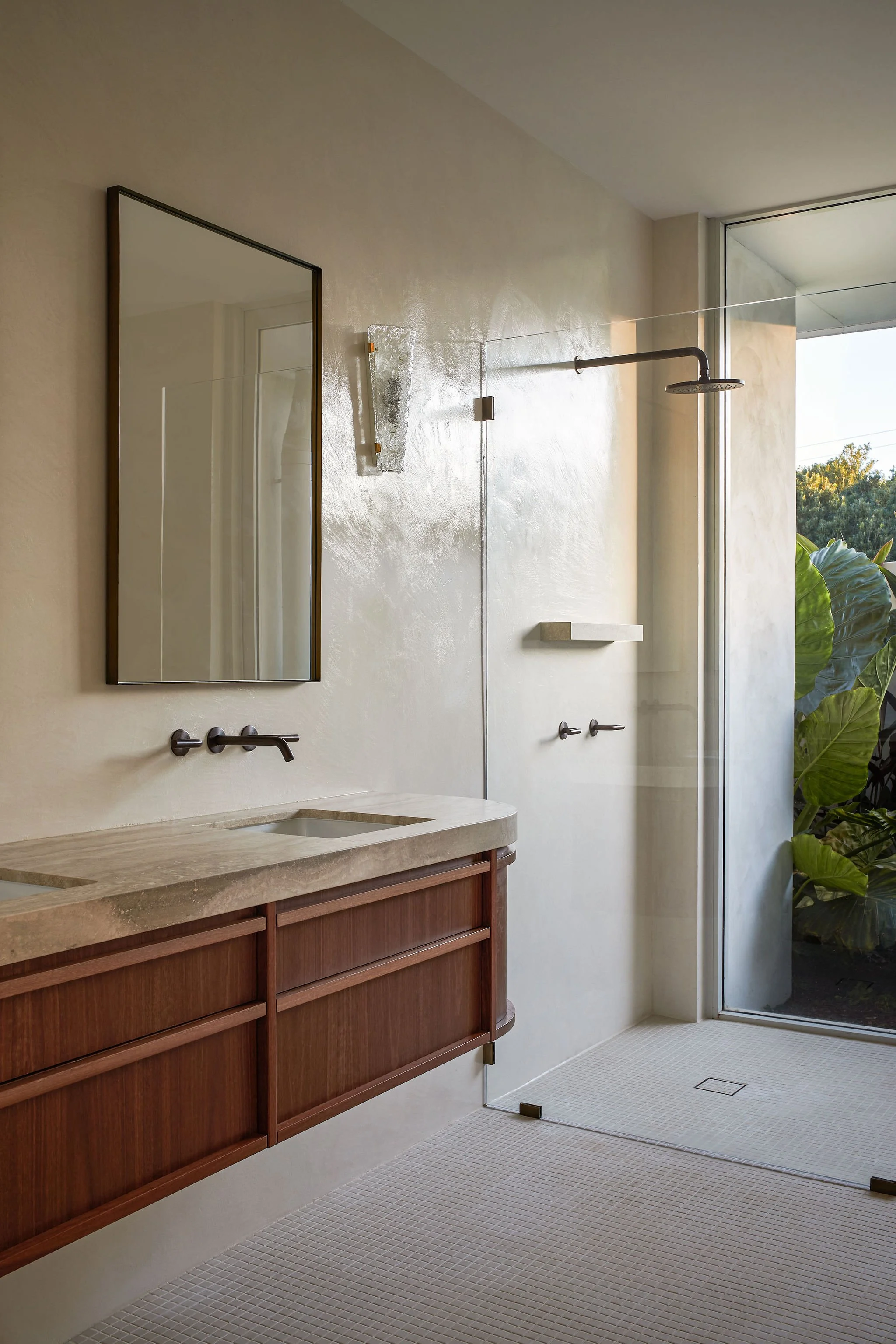 The principles of modernism were the starting point for the design of the Brooklet house. Modernist architecture was driven by function and for this house the functions of importance relate to young family living and life on the farm. The design also prioritises the views offered by the site, across the valley and towards the ocean as well as across the Macadamia orchid and towards the sunset to the west. Aesthetically, simple forms, linear elements and projecting rooflines hark back to these modernist principles as does the minimal material palette in a neutral chalky render, timber and light stone.
